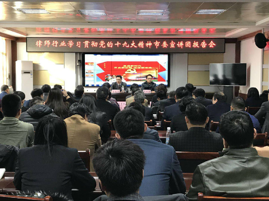 市司法局副局长、市律协党委书记高振平主持了报告会,并对全市律师行业深入学习贯彻党的十九大精神进行了部署。他要求,全市律师行业要深刻学习领会、充分认识党的十九大的重大意义。要带着信仰、带着感情、带着责任,全面学习领会党的十九大精神,准确把握党的十九大的主题,自觉用习近平新时代中国特色社会主义思想武装广大律师头脑、指导律师工作实践、推动律师工作发展。要根据市委、市委政法委和市局党委的统一部署,在全行业迅速掀起学习宣传贯彻党的十九大精神的热潮。律协党委成员、各支部书记要带头先学一步、学深一层,要组织广大党员和全体律师原原本本地学、原汁原味地学、全面系统地学,确保真正学懂、弄通、学透。要按照十九大关于新时代党的建设总要求,进一步加强全市律师行业党建工作,全面推进律师行业党的政治建设、思想建设、组织建设、作风建设、纪律建设,充分发挥律所党支部的战斗堡垒作用和党员律师的先锋模范作用,领导、组织、动员广大律师坚定不移跟党走,依靠自身坚定的信念、优良的作风、良好的形象,使律师真正成为有尊严的职业、成为令人尊重的职业,成为党和政府放心、人民群众信赖的一支队伍,以贯彻落实十九大精神的新成效,开创全市律师事业发展的新局面。