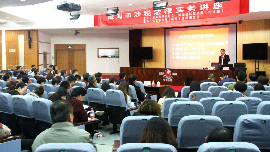 11月9日,由威海市律师协会和威海经区政法委(司法局)主办、北京市京师(威海)律师事务所承办的涉税法律实务培训班在威海市经区管委会三楼多功能厅举行,300余名律师参加了本次培训。