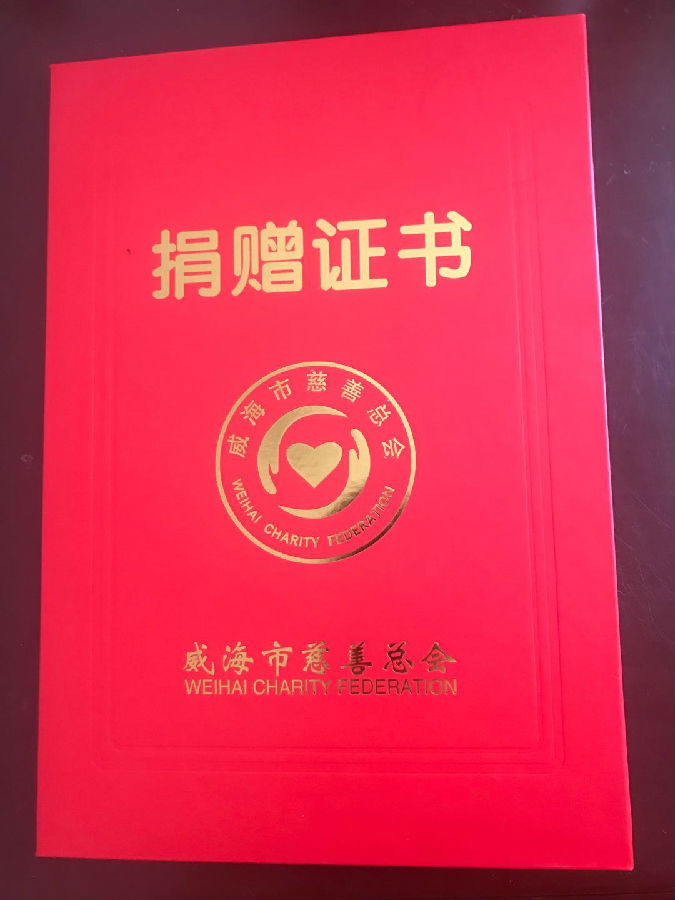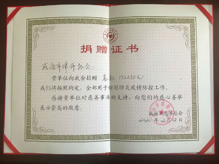 威海市慈善总会向威海律师协会颁发荣誉牌和捐赠证书