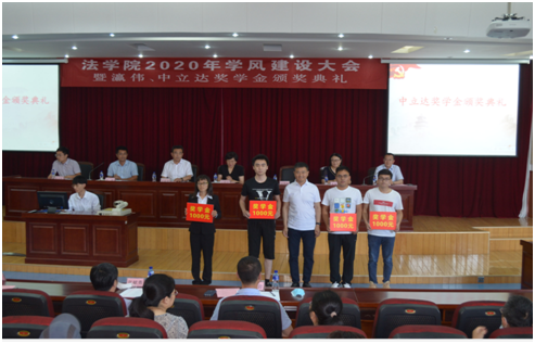 2020年6月21日,山东中立达律师事务所刘秀峰主任应邀参加山东工商学院法学院召开的“2020年学院学风建设大会暨奖学金颁奖典礼”,对评选出的13名法学专业优秀学子颁发了“中立达”专项奖学金。