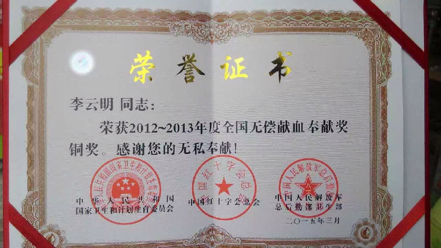 2015年8月,中国红十字会总会授予李云明律师2012-2013年度全国无偿献血奉献奖铜奖。据了解,山东合度律师事务所李云明律师连续11年、20次参加义务献血,总计献血已达5600ml。无偿献血是每个公民应尽的责任,也是一种社会公德,传递着社会正能量,“爱心+勇气” =光荣的献血者,诠释了关爱社会和无私奉献的精神,各律师事务所要加大宣传力度,让广大律师对无偿献血知识有更深的了解,进一步转变献血观念,提高无偿献血意识,带动更多群众参与到无偿献血工作中来,形成互帮互助的社会氛围,为创造文明、关爱、和谐的社会发挥积极的能量。