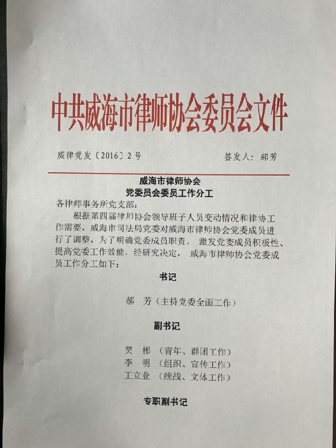 威海市司法局党委关于调整市律师协会党委成员的通知